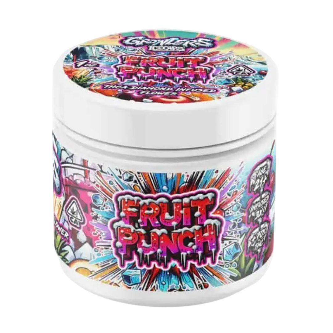 Growlers Icecaps Fruit Punch are premium infused cannabis flower nuggets, crafted by taking high-quality indoor-grown buds and coating them with a layer of potent cannabis extract, then finishing them with a dusting of THCA isolate or crystalline cannabinoids. The result is a frosted, snow-covered appearance that isn’t just visually striking—it’s a clear signal of extraordinary potency.